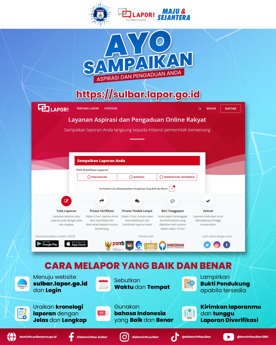 MAMUJU, Pemerintah Provinsi Sulawesi Barat melalui Dinas Komunikasi dan Informatika mengajak masyarakat untuk tidak ragu melaporkan berbagai persoalan pelayanan publik yang belum berjalan optimal menggunakan aplikasi SP4N-LAPOR (Sistem Pengelolaan Pengaduan Pelayanan Publik Nasional – Layanan Aspirasi dan Pengaduan Online Rakyat).