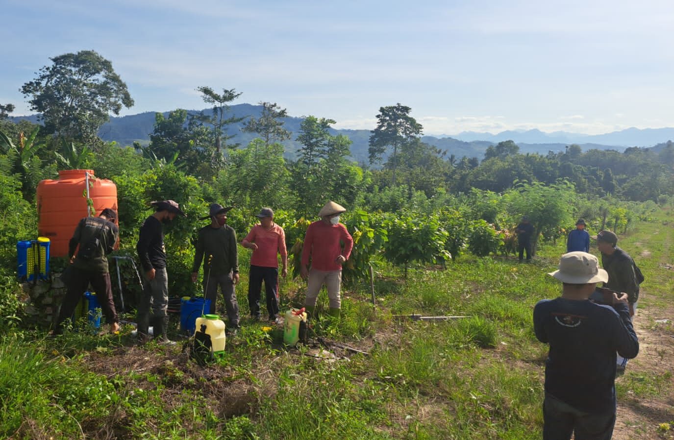 Polewali Mandar, Untuk menekan serangan penyakit Vascular Streak Dieback (VSD) pada komoditas kakao, UPTD Balai Proteksi dan Perbenihan Dinas Perkebunan Daerah Sulawesi Barat melakukan penyemprotan insektisida, fungisida, dan pengaplikasian pupuk NPK Kristalon di Kebun Induk Batu Panga Da’ala, Kecamatan Luyo, Polewali Mandar pada Selasa, 3/3/2026.